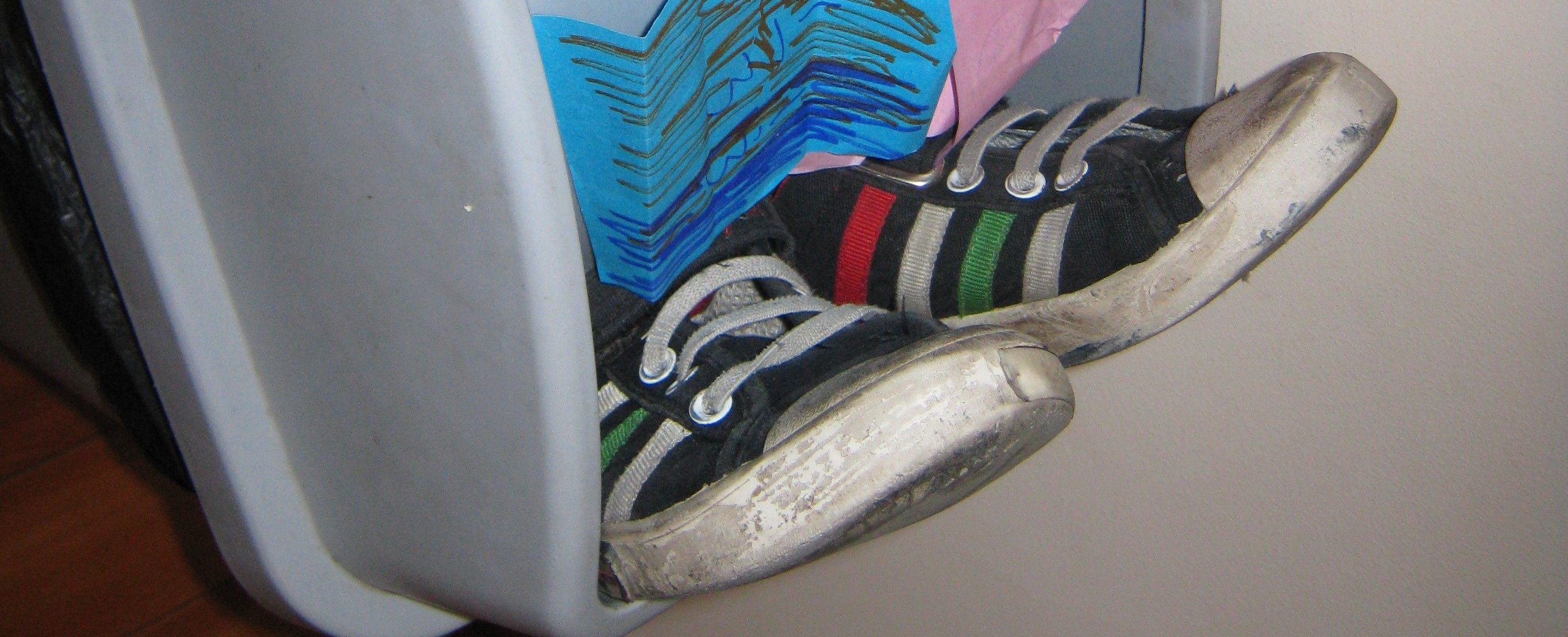 His mom bought him new shoes today. These shoes in the trash were the ones she insisted he needed just a few months ago. She says kids outgrow shoes, but I wonder why she bought him those old shoes if she knew he was just going to outgrow them. Is this normal for kids to outgrow shoes? Sounds like a marketing ploy by shoe companies to make us buy new shoes four times a year.