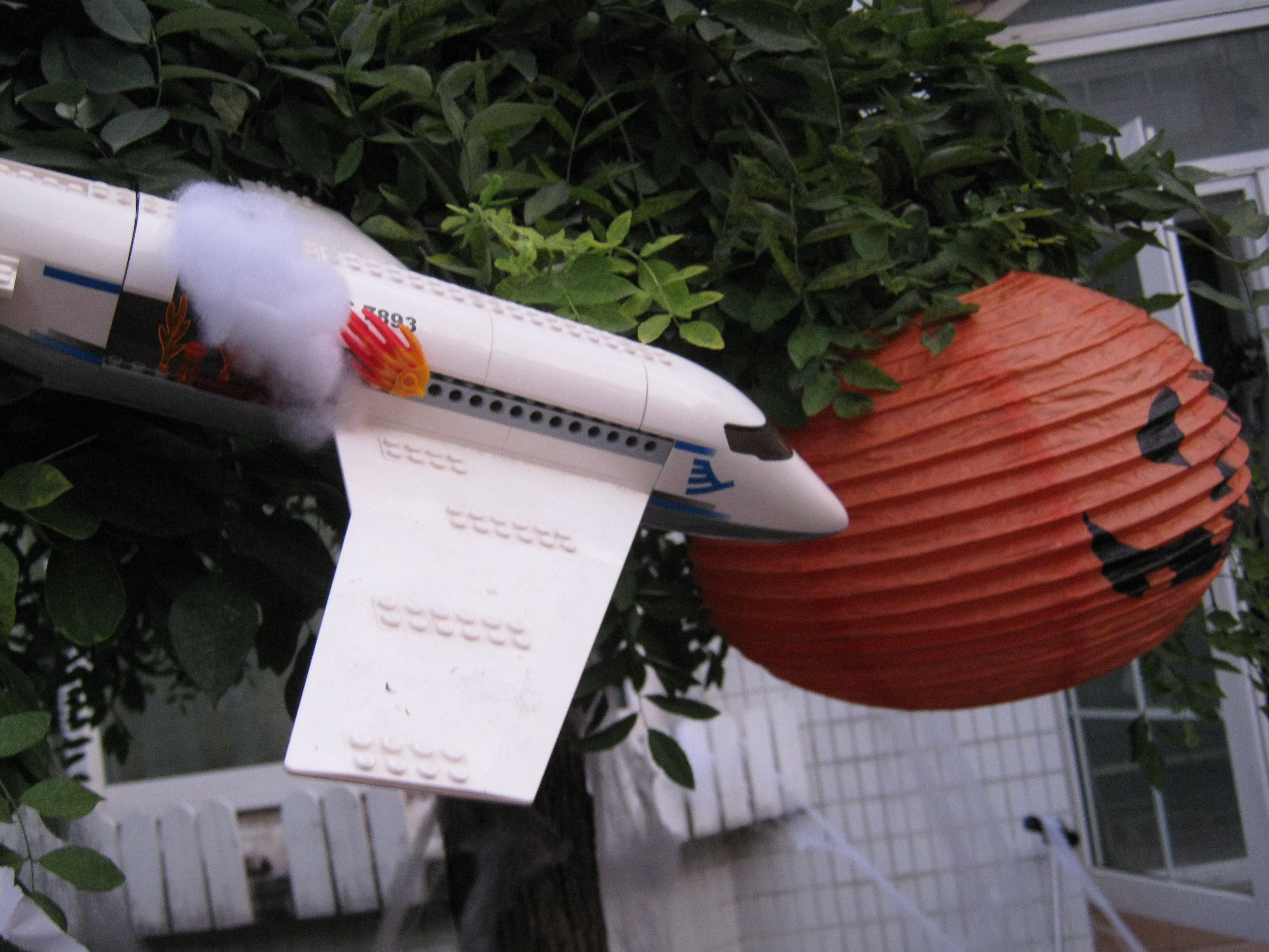 We decorated our yard for Halloween yesterday, and because most people don’t genuinely fear plastic skeletons and fake cobwebs, I always like to include something that plays on a genuine fear. This year I chose fear of flying: