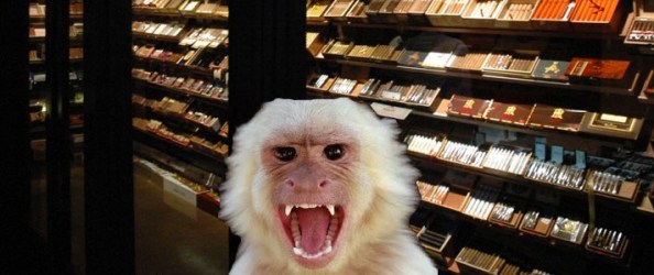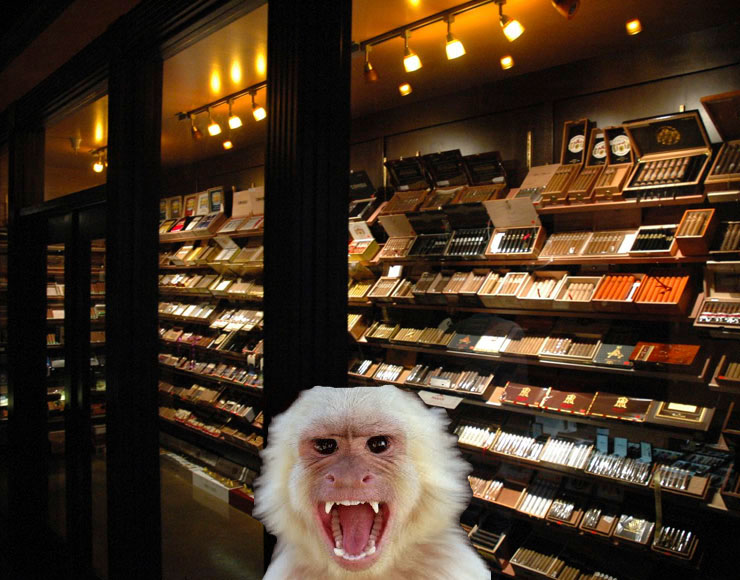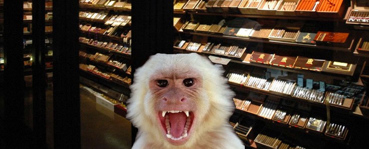 By the looks of that monkey, does he really need a pointy stick? I would think his soulless eyes and the straight-from-the-pits-of-hell hissing would be more than enough to keep her away from your humidor.