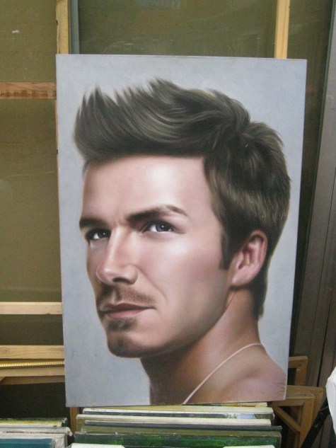 The artists’ street, sometimes called the Painters’ Market, has always been one of my favorite places to go and watch the artists work. One thing that always catches my attention is how often they’re painting giant portraits of celebritites, like the one below of British footballer David Beckham: